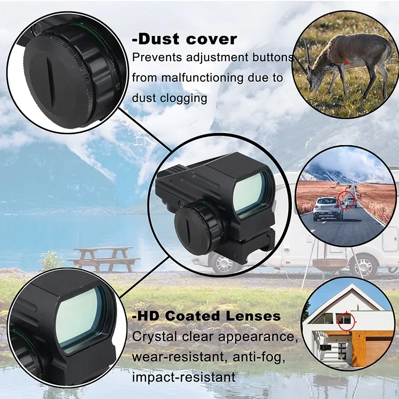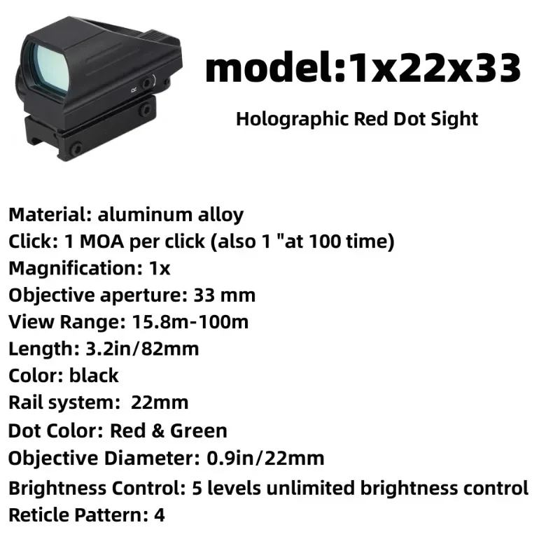 Multi Optical Coated Sight with 33mm reflex lens aperture provides a wide field of view, suitable for normal and rapid-firing shooting of moving targets. INTEGRATED RED LASER with rat tail independent switch can reach about 200 Yards distance.