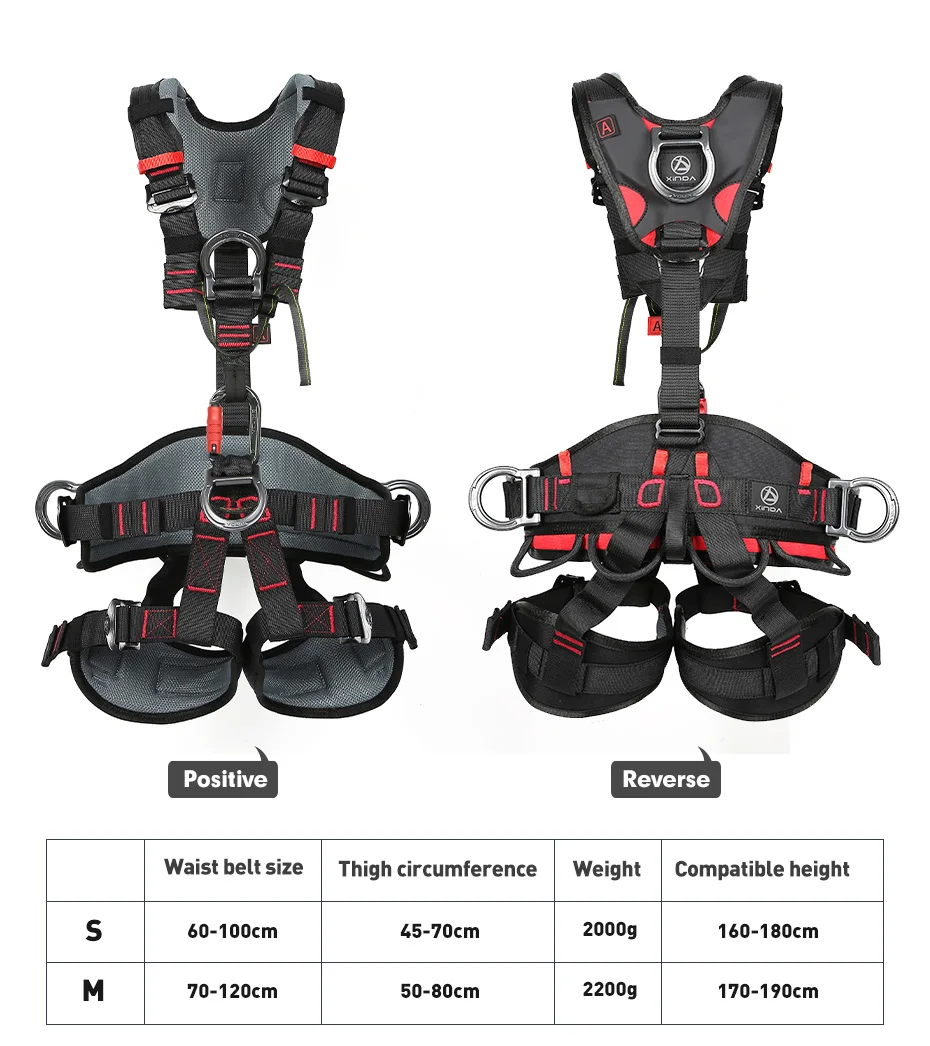 Brand:XINDACode: H-A9550Name: Fullbody safety harnessMaterial: Strengthened dacron、Strong aluminum alloyColor: BlackSize: S(Waist belt size 60-100cm、Thigh circumference 45-70cm)L(Waist belt size 70-120cm、Thigh circumference 50-80cm)Net weight(±5%): S(2000g) L(2200g)Compatible height: S(160-180cm) L(170-190cm)Certification: CEMultipurpose: working with a hand and chest ascender for climbing, expanding, caving, SRT andoperating at heightAdvantage!High-strength polyester material,Light and wear resistant.Friendly reminder: please check and maintain your gear in order to avoid danger caused bymisuse while working or playing at height